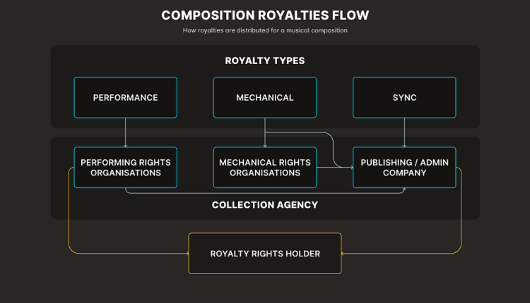 Royalties are a primary income source for musicians, songwriters, producers, and composers. They are monetary payments made to the owners of the rights to musical works, compositions, and recordings. These payments are made whenever a composition is played, performed, reproduced, or used in public. Whether it’s the manufacture of a vinyl record, streaming online, radio plays, or syncing to film, ads, or games, every time a composition is used a royalty is rewarded.